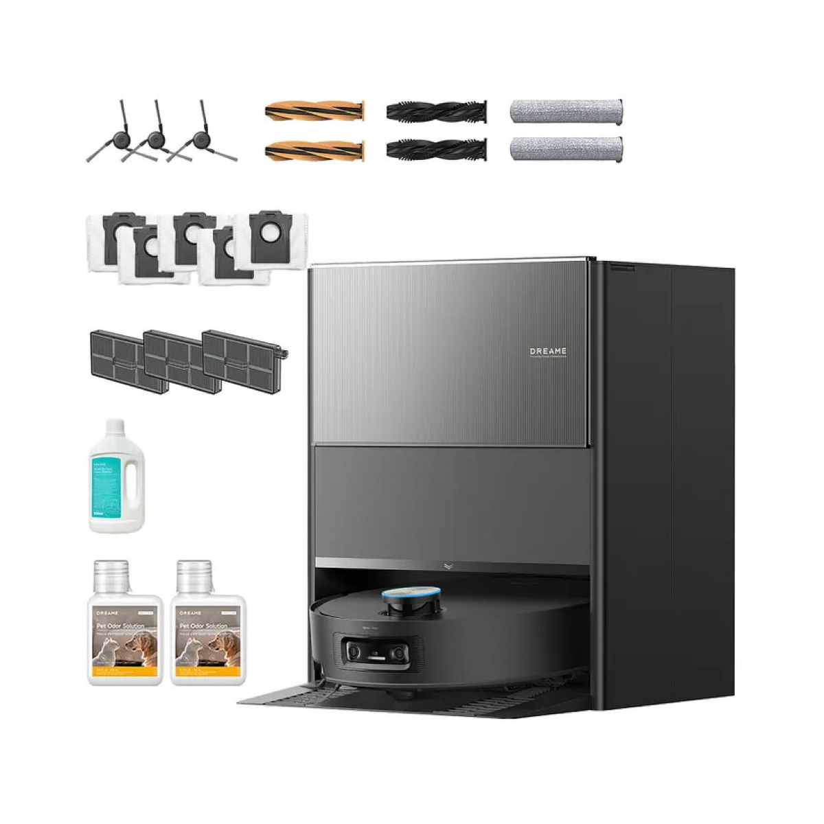 | Contents | Robot, base station, main brush, side brushes, dust bags, cleaning tool, mop pads, docking ramp, solution bottles, documentation |